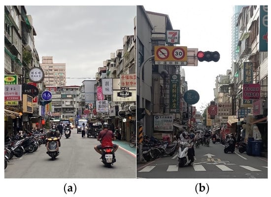 University neighborhoods in Taiwan. (a) A university neighborhood in Taipei City. (b) A university neighborhood in Tainan City. Source: Pictures taken by the author (H.-Y.L.).