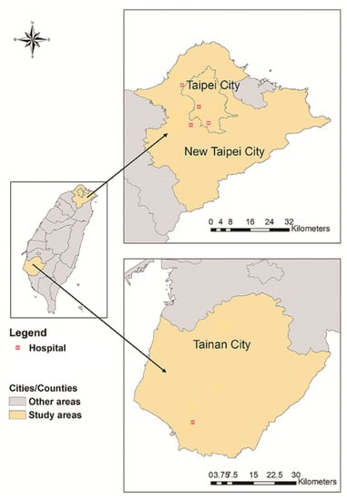 The hospitals enrolled in our study included the following: Shuang Ho Hospital and Mackay Memorial Hospital (Tamsui Branch) in the southwest and northeast regions of New Taipei City, with a population of 401,086 and 184,660, respectively; Wan Fang Hospital and Mackay Memorial Hospital (Taipei Branch) in the southern and central regions of Taipei City, with a population of 256,942 and 210,447, respectively; National Cheng Kung University Hospital in the northern region of Tainan City, with a population of 126,579. All hospitals (4600 beds in total) are located in urban regions and accredited as advanced emergency responsibility hospitals in Taiwan, delivering extensive treatment for injured patients (Figure 2). We retrospectively reviewed the hospital data of the patients treated in the emergency departments (EDs) for RTIs between 1 January and 31 December 2017.