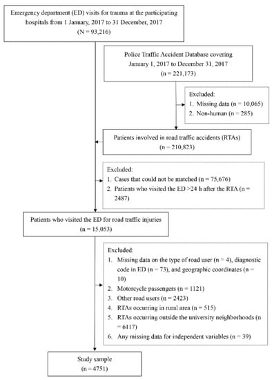 Flow chart for sample selection. ED, emergency department; RTA, road traffic accident.
