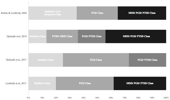 Following a person-centered approach using latent class analysis (LCA) research on psychological sequelae following bereavement, researchers examined classes of patients presenting similar symptom profiles. LCA represents a powerful method of cluster analysis that can be used to identify patterns of similar responses for categorical indicator variables (e.g., symptom present or symptom absent). The goal is to create a set of exclusive latent classes; that is, to split respondents into groups with homogeneous symptom profiles. This approach has been previously used in bereavement literature to examine symptom profiles of the three most commonly prevalent syndromes in bereaved individuals: MDD, PGD, and PTSD. For instance, Djelantik and colleagues (2017) [18] used this approach to investigate symptom clusters of MDD, PGD, and PTSD in a bereaved community sample, revealing three classes of symptoms: a PGD class (48%), a PGD and PTSD symptom profile class (27%), and a resilient class (25%). Another study applying LCA to a trauma-exposed bereaved sample revealed four classes: a resilient class (13%), a class with prominent PGD and MDD symptoms (23%), a class with PGD and PTSD symptoms (20%), and a class with MDD, PGD, and PTSD symptoms (45%) [19]. A study including a disaster-bereaved sample again revealed three classes as the best fit: a resilient class with low probability of MDD, PGD, and PTSD symptoms (20%), a class characterized only by PGD symptoms (41.8%), and a combined class with a moderate to high probability for the presence of all three symptom clusters (38.2%) [20]. One recent study focusing on a recently bereaved sample examined symptoms of MDD, PGD, and PTSD within the first 6 months of bereavement and revealed again a three-class symptom profile: a low-symptom class (35.4%), a predominantly PGD class (29.8%), and a high-symptom profile class (34.8%) including symptoms of all symptom clusters [21]. For a summary of the main findings of previous latent class research following bereavement, see Figure 1.