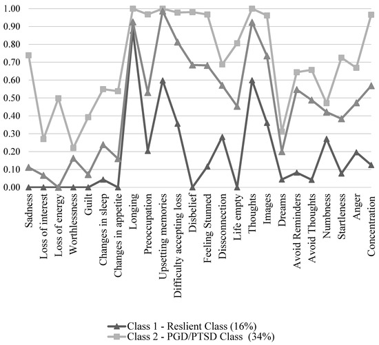 The fit indices for the latent class profiles are listed in Table 3. Based on the goodness-of-fit indices, three class solutions appeared adequate with a better fit and interpretability, and were therefore retained. We considered a value of >0.60 as a high probability of symptom endorsement [19,37]. The three-class model revealed one resilient class (class 1; 16% of the sample), one class with a higher probability for some symptoms of PGD and intrusion symptoms of PTSD (class 2; 50% sample), and one class with prominent symptoms of PGD and PTSD (class 3; 34% of the sample). The distinct symptom occurrences are presented in Figure 2.