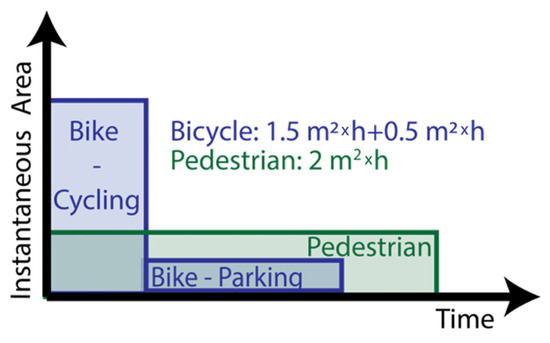 The decision support method used in this paper is based on the time-area concept, which combines the space requirements of ground-based transport units while moving and parking into one metric [13] and is defined as the ‘ground area consumed for movement and storage of vehicles, as well as the amount of time for which the area is consumed’ [22] In other words, the time-area requirement measures the area required for a transport activity and the duration for which it is occupied. Figure 1 illustrates the calculation of the time-area requirements. A pedestrian might travel for 1 h and requires 2 m2 to move comfortably during this time. While a cyclist might travel four times as quickly as a pedestrian and can cover the same distance in 15 min, the cyclist requires a larger area to move comfortably, e.g., 6 m2. Hence, the time-area requirements of the pedestrian and cyclists are 2 m2 × h and 1.5 m2 × h, respectively. In contrast to a pedestrian, a cyclist must store the bicycle after a trip, which increases the time-area requirement by, for example, an additional 0.5 m2 × h for a 30 min stopover [13].