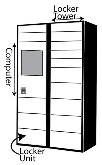 The fixed and modular parcel lockers were assumed to have a similar size to typical Amazon lockers (see Figure 3). A parcel locker unit which can fit one parcel occupies an area on the ground of 45 × 45 cm2, and 10 parcel locker units (i.e., compartments) can be placed above each other. Note: In reality, the height of these individual parcel locker units varies to accommodate different parcel sizes, as shown in Figure 3. However, to simplify the simulation, it is assumed that each parcel fits in the allocated parcel locker unit (i.e., the parcel size has been ignored). The computer to operate the parcel locker has the size of five locker units. One computer is installed at every CDP, regardless of how many lockers units are installed. Given that in the future, when the proposed automated delivery concepts might be operational, locker units could open automatically when the customer approaches the locker with his or her phone. This is similar to cars unlocking themselves when the driver goes near the car with his or her key.