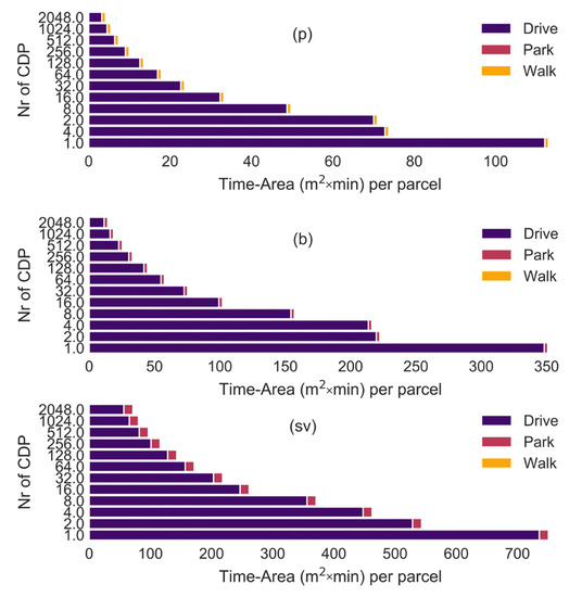 The twelve CDP networks modelled in this study represent a range of parcel locker network densities collectively similar to the spatial distribution of parcel lockers in Germany [31]. In this study, the average roundtrip walking distance between the customer’s home and CDP ranges from 4.7 km (1 CDP) to 135 m (2048 CDPs) for pedestrians, 5.2 km (1 CDP) to 160 m (2048 CDPs) for cyclists and 6.0 km (1 CDP) to 435 m (2048 CDPs) for car drivers. The distance differs, as each mode of transport can use a different street network, and one-way streets can increase the short distances for drivers. This effect is reduced the further the customer has to travel to the CDP. Having 16 CDPs results in an average roundtrip distance between the CDP and the customer’s home of around 1.3 km. Note: the one-way trip distance is 600 m for residents in German cities (=1200 m round trip) and 3 km (=6 km round trip) in rural areas [31]. The time-area requirements for customers are illustrated in Figure 6. As expected, the time-area requirements increased with a reduction in the CDP density, and the time-area requirements of small vehicles (sv) were around seven times larger than for pedestrians. The majority of the time-area requirements are caused by the customer moving from their home to the CDPs and back. Pedestrians do not have any parking requirements. The time-area requirement for customers to walk from their parked bicycle or car to the CDP is so small that it is almost invisible in Figure 6(b) and Figure 6(sv). The distance to CDPs was larger for pedestrians when four CDPs were used compared to when two CDPs were used due to the locations of the CDPs, which was determined by the Random Points inside Polygons (fixed) in QGIS using the largest possible separation.