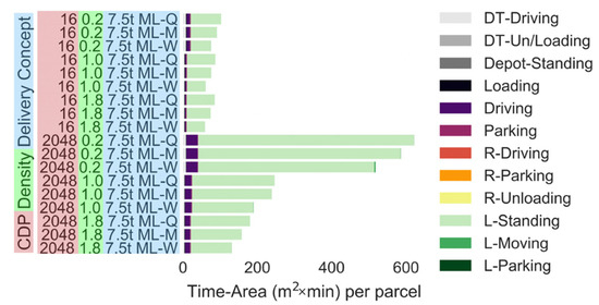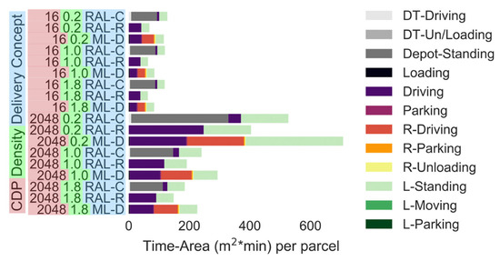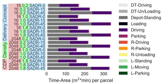 Parking at the city depot (i.e., 57 m2 × min–230 m2 × min depending on the average wait time) and driving (i.e., 93 m2 × min) are the two main contributors to the time-area requirements of SADRs (Figure 10). Unless the demand for SADRs is completely uniform throughout the day (i.e., SADRs are constantly delivering parcels during operating hours), the parking at the depot is the largest contributor to the time-area requirement. This is amplified by the fact that SADRs also need parking spots at the depot, even if they are not used during the low-demand season. The time-area requirements while driving are larger by factors ranging from 2.68 (CDP 256, density 0.2) to 142 (CDP 1 density 2.0) for SADRs when compared with a 7.5 t truck, as parcels can be stacked within the truck, and the average speed of delivery vans (i.e., driving speed) is faster compared to a SADR (i.e., walking speed).