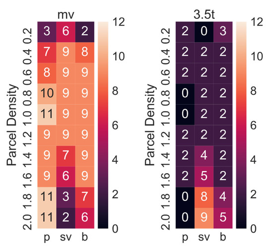 The best maximum delivery van size varied in the sensitivity analysis between medium vans (mv) and 3.5 t vans (Figure 14). The numbers do not add up to 12, as sometimes the best delivery concept did not include a delivery vehicle (i.e., RAL and SADR).