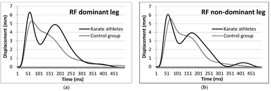 Top-level karateka’s agonist muscles (VL, VM and RF) Td, Tc and Tct are found to be different than in the control group. The habituation to ballistic exercises in these athletes has most probably induced specific neuromuscular changes in muscle responsiveness [45]. The examined VL and VM muscles are extensors in the knee joint [46], while the RF is an extensor in the knee and also a flexor in the hip joint [47]. Specifically, the RF muscle performs both of these actions during a kick by increasing the speed of the knee and reducing the time of lifting the foot up from the ground [13,48]. Since both hip flexion (jap. Hiki ashi) and knee extension movements are used in karate when executing kicks, the RF developed different contraction qualities than other muscles from the knee extensor group. These differences are reflected in a specific TMG record based on the automaticity of the RF double activation during leg karate techniques. As shown in Figure 1a,b, the complexity of the kicks’ performance generated two distinct contractile activities on the muscles in both dominant and non-dominant legs and in all karate practitioners, unlike the control group. KAs’ RF muscles activate in a double peak pattern, illustrating the relaxation phase after the foot leaves the surface (silence between the pulses on the KA signal group). This pattern is highlighting the importance of the ability to contract, relax and contract again quickly. The first peak of RF muscle activity is associated with initiation of motion as the hand [49] or foot [50] gained speed, while a relaxation phase is observed following the second peak associated with the body stiffening at impact (in case of strikes to the body) or energy exertion—jap. Zanshine (in case of strikes to the head). Studies that examined voluntary strikes with the EMG method also showed double muscle activation in elite mixed martial arts fighters [51] and karate athletes [52].