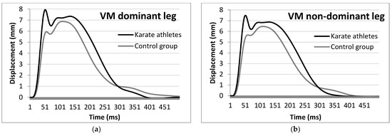 Regarding the results of the TMG, KAs showed a great ability to rapidly generate force during involuntary contractions (Td and Tc lower than 30 ms) [34,35]. When compared to the NAs, KAs showed significantly lower Td values in the RF (non-dominant leg), VL (dominant and non-dominant leg) and VM (non-dominant leg) muscles. The Td results are quite similar to those found in the RF and BF muscles of elite and subelite futsal players [35], VM and BF of professional soccer players [36] and VM of elite amateur road cyclists [37]. The Tc parameter of the non-dominant RF, both dominant and non-dominant VL and non-dominant VM muscles showed significant differences when compared with the NAs. Likewise, a study by Garcia et al. [38] showed similar values of Tc of the RF and VL muscles in elite wrestlers. Tct was found to be significantly lower in KAs (RF of the non-dominant leg, dominant and non-dominant VL, dominant and non-dominant VM and ST of the non-dominant leg) than in the NAs. The VM of the KAs’ dominant legs also had significantly lower values in Tct, despite the fact that neither the Td nor Tc were significantly different. Td, Tc and Tct differences suggest that KAs are more explosive than the NAs and they have a greater number of type 1 fibers [39,40]. These results are in accordance with the fact that athletes who regularly take part in planned physical activities as a consequence benefit from adaptation to the training [41], which is manifested in a greater speed of contraction than in the NA group. On the other hand, significant differences were mostly found in the Dm and RMTD of the KA antagonist muscle group (knee flexors). The Dm values of the BF, ST and VM (dominant leg) muscles were higher than in the NAs, which is in contrast to studies showing that lower Dm values are associated with greater exposure to strength, power or plyometric training [42,43]. However, karate training and competition demands are proved to increase lower limb muscle flexibility [21,44], so this impact contributes to higher amplitudes of muscle displacement in this specific TMG variable. Similar values of Dm are found in professional soccer players’ BF [36], elite amateur road cyclists’ BF muscles [37] and elite futsal players’ RF [35]. The ability of muscles to achieve the most intense possible contraction was also found to be significantly higher in top-level karateka than in the NAs. KAs have a greater RMTD than the NAs in the case of the BF (dominant and non-dominant leg), ST (dominant and non-dominant leg), RF (dominant leg) and VM (dominant and non-dominant leg) muscles.