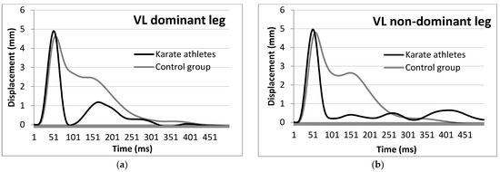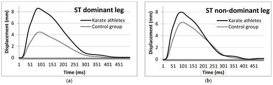 Significant differences on a general level between dominant knee joint extensors were mainly influenced by the differences in Tct of VM and VL. This suggests that agonist muscles of the dominant KA’s leg generally have different levels of twitch force generation speed, muscle responsiveness, and muscle fiber composition [28,33]. On the other hand, significant differences between dominant knee flexors were influenced by Dm and RMTD of the BF and ST, while non-dominant knee flexors were mainly influenced by differences in the RMTD variable of BF and ST muscles. Higher RMTD values suggest strength characteristics in the breaking action of the antagonist hamstring muscles, due to the specific learning strategies adopted in order to better control the kicking impact imposed by the karate competition rules [24,25].