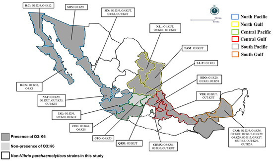 In addition, the recent temperature increases could facilitate the establishment and spread of deliberately or accidentally introduced species and increase the rates of Vibrio-associated illness in other parts of the world [49,50,51,52,53]. It has been reported that elevated temperatures facilitate the proliferation of this pathogen [54]; however, in this study, pandemic V. parahaemolyticus strains were detected in six geographical regions of Mexico with different environmental conditions and, thus, temperatures. As such, it is highly likely that the warming of our coastal oceans (e.g., the Pacific Ocean and the Gulf of Mexico) will accelerate the spread of Vibrio parahaemolyticus to the southern latitudes, from the North Pacific region to the South Gulf region, and possibly further than 2700 km, where the warming effect is projected to be most pronounced.
