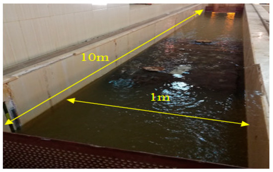 The experimental work was carried out on a concert channel of 1.0 m width (B), 10 m length, and 1.0 m depth as shown in Figure 1. It has a variable flow rate pump from 2 to 70 L/s and graduated rulers for monitoring water depth upstream and downstream of the horizontal biofilter. The biofilter is made of star-shaped plastic media. The rate of flow in the channel is determined by measuring the head of water (h) above the lab-calibrated weir, which was used to control the inlet discharge to the channel. The discharge equation obtained for the weir can be expressed as [35]: