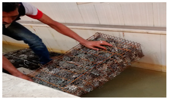 - The cages containing the plastic media were installed inside the channel crosswise (where the length of the cage is 1.0 m equal to the width of the channel) to achieve a height of 0.78 m in the case of flow through the biofilter and 0.52 during flow over the biofilter (as shown in Figure 5a,b);