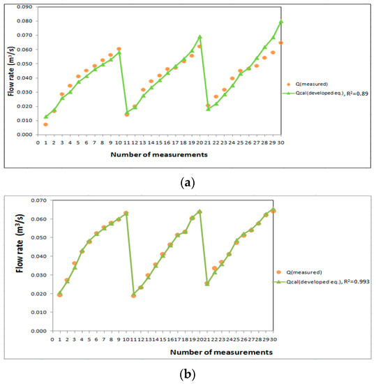 Comparison between the flow rate through the biofilter by the developed formula with the measured values for (a) flow through the biofilter and (b) flow over the biofilter.