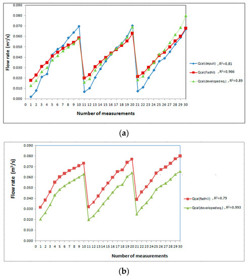Furthermore, the results of the developed Equations (11) and (12) were compared with the flow rate obtained from the Dupuit and Fadhil equations for flow through the biofilter, and we compared with the Fadhil equation over the the flow above the biofilter as shown in Figure 7. The results showed that the flow rate of the developed formula for the flow through the biofilter is closer to the Fahil equation than the Depuit as shown in Figure 7a,b. Dupuit presented only one equation for flow throgh the biofilter but Fadhil presented two equations for both flow through and above the biofilter of gravel media. The results of the developed equations are in good agreement with the other equations results for both cases of flow through and above the biofilter.