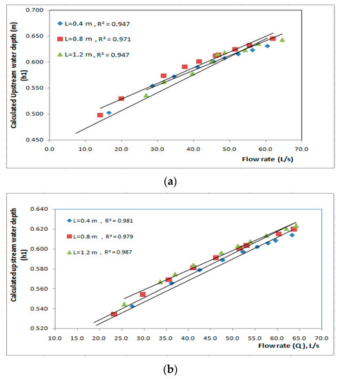 Equations (13) and (14) are used to determine the upstream water level (h1) at different lengths for different discharge. Figure 8a shows the relationship between calculated upstream water depth (h1) and discharge (Q) passing through the biofilter at different length of biofilter (0.4 m, 0.8 m, and 1.2 m). The relationship between calculated upstream water depth (h1) and discharge (Q) is linear for all the lengths of biofilter. For same discharge, the upstream water depth (h1) value increased with increasing length of the biofilter. As shown in Figure 8a, the length L = 1.2 m gave the highest values of calculated upstream water depth (h1), which ranged from 0.436 m to 0.631 m when the flow rates increased from 7.2 to 60.4 L/s with correlation coefficient R2 = 0.947, followed by the length L = 0.8 m, for which the upstream water depth (h1) ranged from 0.498 to 0.644 m when the flow rate increased from 14.1 to 62.1 L/s with correlation coefficient R2 = 0.971. However, the length L = 0.4 m gave the lowest values of the upstream water depth (h1), which ranged from 0.537 m to 0.655 m when the flow rates increased from 20.6 to 64.6 L/s with correlation coefficient R2 = 0.947. The same was shown for flow over the biofilter as shown in Figure 8b.