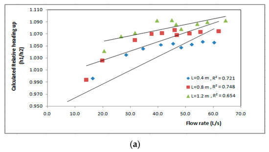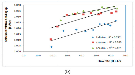 For flow through and over the biofilter, the relationship between calculated relative heading-up (h1/h2) and discharge (Q) is linear for all the lengths of biofilter. For same discharge, the calculated relative heading-up (h1/h2) value increased with increasing length of the biofilter. As shown in Figure 9, the length L = 1.2 m gave the highest values of calculated relative heading-up with correlation coefficient R2 = 0.721, 0.777, respectively, followed by the length L = 0.8 m with correlation coefficient R2 = 0.748, 0.585, respectively. However, the length L = 0.4 m gave the lowest values of the calculated relative heading-up with correlation coefficient R2 = 0.654, 0.834, respectively, as shown in Figure 9a, and the same was shown for flow over the biofilter as shown in Figure 9b.
