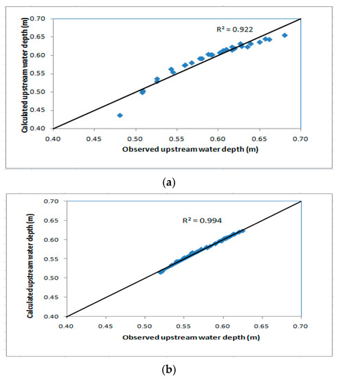 The results of calculated upstream water depths (h1) using Equation (13) are plotted against the measured values in the laboratory for flow through biofilter. A good agreement was obtained between the calculated upstream water depth (h1) and the measured in the laboratory as shown in Figure 10a, and the same was obtained for flow over the biofilter as shown in Figure 10b.