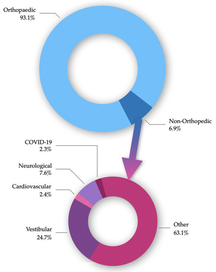 Percentages of the total number of subjects included in the present review with either orthopedic or non-orthopedic complaints. Non-orthopedic complaints were further divided by category (“Other” refers to a group of various pathologies, including: oedema, fibromyalgia, overweight and obesity, spinal disorders, acquired brain injury, pulmonary, oncology and not-better-specified diseases).