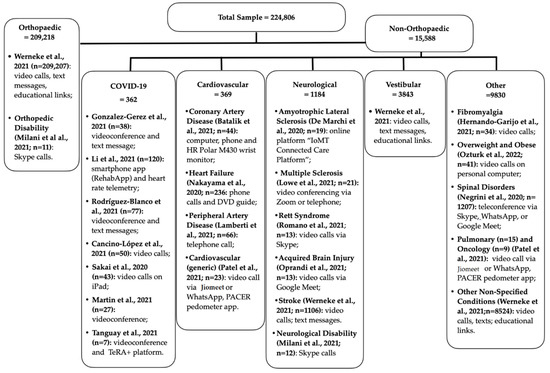 Twenty studies were included in the final analysis (see flow diagram in Figure 1). Of the included studies, 6 were RCTs, 10 were observational studies and 4 were exploratory studies (feasibility and pilot trials), including a total sample of 224,806 subjects: 209,218 with orthopedic complaints and 15,588 with non-orthopedic conditions. Of the latter, 3843 were patients with vestibular dysfunction, 1184 with neurological conditions, 369 with cardiovascular diseases, 362 with COVID-19 and 9830 with a variety of other pathologies (fibromyalgia, overweight and obesity, spinal disorders, pulmonary, oncology, oedema and other not-better-specified pathologies) (Figure 2). It is important to note that the number of orthopedic, vestibular and some of the “other pathologies” patients mainly come from one study alone [22].