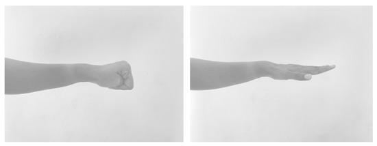 In the rapid G&R test, the participants were asked to grip and release their fingers with their forearm in pronation and wrist in mild extension (Figure 2). The number of completed cycles of movement within 10 s was separately counted on each side [24,28,36].