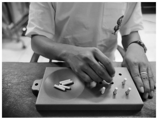 This test was undertaken with the participant seated at a table facing the center of a tray with both a shallow dish and holed board on the tabletop (Figure 3). The tray was placed so that the shallow dish, which held nine pegs, was on the participant’s dominant hand side, while the peg holes were on the non-dominant side. In the task, the participants took pegs from the dish and placed them in the nine peg holes on the other side of the tray. Instructions and a brief demonstration were provided. The participants took a practice test before completing the assessed task, using their dominant hand first, followed by testing using their non-dominant hand. In the test, the participants took the pegs sequentially and placed them in the pegboard until all nine peg holes were full. Then, again with the dominant hand, the nine pegs were removed one by one from the pegboard and put back into the dish without a rest. The time taken to complete the test was recorded using a stopwatch from the moment the participant touched the first peg until the last peg hit the dish. The test was then repeated with the participant’s non-dominant hand and the pegboard rotated so that the dish was in front of the non-dominant hand. Again, the time was recorded. All the participants took part. If a participant dropped a peg or the test was otherwise interrupted, the evaluator signaled the participant to stop, and a new test began [26,37,38].