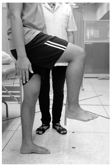 While standing, the participants were asked to march in place, raising their knees to 90° without holding anything to maintain balance. The steps were taken at maximum speed over 10 s (Figure 4). Participants who were apt to fall or exhibited anxiety about the test were asked to do this near a handrail. The participants were watched by a supervisor who stood beside them throughout the test [24,28,39].