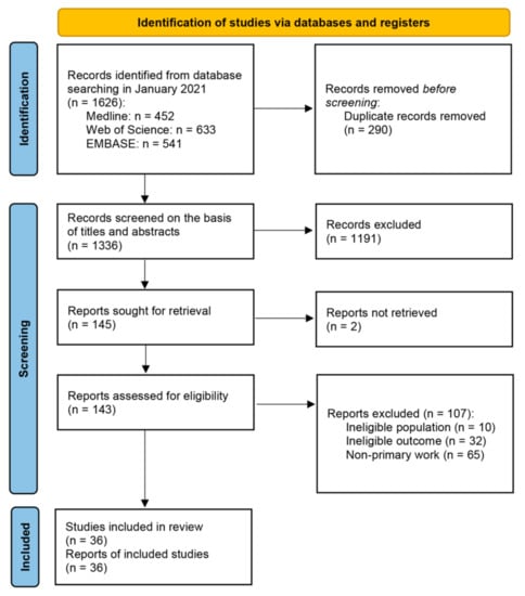 A total of 1626 records were identified from database searching. After removing duplicates, 1336 titles and abstracts were screened, of which 145 remained. A total of 143 full texts were retrieved and assessed for eligibility, of which 36 studies met inclusion criteria (Figure 1). The excluded studies and reasons for exclusion can be found in Supplementary File, Table S3.