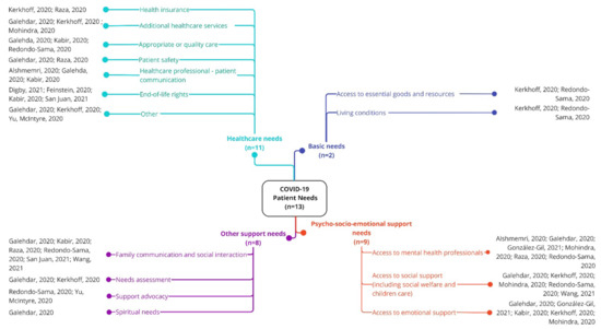 Psycho-socio-emotional needs for patients with COVID-19 were identified in nine studies (n = 9) [13,24,45,50,54,58,68,71,76]. As COVID-19 patients might suffer from many mental health concerns (e.g., death anxiety, social stigma, hopelessness, separation anxiety) during and after the disease, the need for access to mental health professionals was noted [13,24,50,54,68,71]. Additionally, the need for low-barrier social support services, including childcare and social welfare of the patient and their family, to mitigate economic concerns was identified [24,45,68,71,76]. Furthermore, emotional support for COVID-19 patients was highlighted as a primary requirement, including more informal support (e.g., general affection, peer support groups) and also the need to implement screening programs to identify patients in need of psychological counseling [24,45,50,58,71].