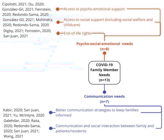 Family members’ needs during the first year of the COVID-19 pandemic [5,24,47,49,50,54,58,66,68,69,71,75,76].