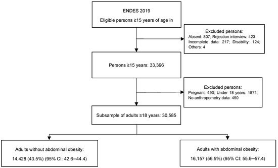 The study population was defined as adults aged 18 years or older, dwellers of urban and rural households selected by the sampling design. We included individuals who had complete information on the variables of interest in the present study. We excluded bedridden individuals, pregnant women, and individuals with physical disabilities that prevent measurement for the outcome of interest. Flowchart of the selection of adults included in the study is shown in Figure 1.