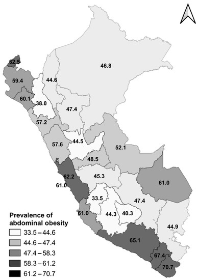 The following supporting information can be downloaded at: https://www.mdpi.com/article/10.3390/ijerph191610333/s1. Table S1. Prevalence of abdominal obesity according to the departments of Peru.