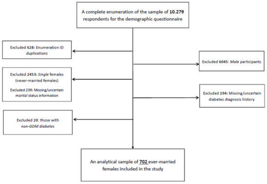 This is a retrospective cross-sectional study using the UAE Healthy Future Study (UAEHFS) data collected from February 2016 to April 2022. We studied 702 ever-married women aged 18–67 years who had complete information on diabetes diagnosis history during their lifetime (Figure 1). The study design, questionnaire, and methodologies of the UAEHFS are described elsewhere [13]. In brief, the UAEHFS is a longitudinal population-based cohort study that aims to explore risk factors for non-communicable diseases (NCDs) among Emirati nationals aged 18 years or above. Emirati adults were asked to fill out the questionnaire and had some physical measurements taken at multiple centers across major cities in the UAE: Abu Dhabi, Al-Ain, Dubai, and Ras Al Khaimah. Due to the COVID-19 pandemic, study recruitment shifted to online enrollment starting from April 2020, and an online questionnaire was introduced to the new participants. Physical measurements, such as BMI, were taken in the participating centers for new participants that filled and returned the online questionnaire once in-person recruitment resumed in September 2020.