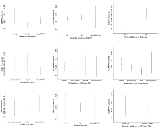 Figure 2 illustrates the prevalence of GDM by each maternal early-life factor in our study. GDM prevalence for each variables of maternal early-life risk factors as follows. Maternal birthweight: <2.5 kg (8.6%), ≥2.5 kg (2.3%), and missing/DN/PNA (5.7%). Parental smoking at birth: no (4.7%), yes (6.1), and missing/DN/PNA (6.7%). Parental history of diabetes: no (2.1%), and yes (6.8%). Parental education: ≤12 years (7.3%), >12 years (7.3%), and missing/DN/PNA (3.6%). Body size at 10 years old: thinner (5.2%), about average (4.7%), plumper (6.1%), and missing/DN/PNA (5.4%). Body height at 10 years old: shorter (6.8%), about average (5.1%), taller (2.2%), and missing/DN/PNA (8.5%). Urbanicity at birth: rural or other non-urban (4.2%), urban (4.9%), and missing/DN/PNA (6.4%). Ever-breastfed: no (5.6%), yes (5.0%), and missing/DN/PNA (5.4%). Overall health up to 10 years old: poor or fair (7.8%), and good or excellent (4.9%).