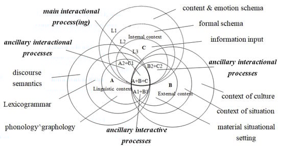 Ecologically, language and context are symbiotic and the rationality of a learning context depends on its holistic construction through the interaction between language(s) and environments. The co-occurrence of cotextual (textual, paralinguistic, and gestural) and contextual (sociolinguistic, pragmatic, and emotive) variables facilitates meaning-making and understanding of spoken interaction []. The situational model [] also believes that sharing multi-dimensional representations (i.e., space, time, causality, intentionality, and reference to main individuals) while aligned with linguistic representations in the process of communication and comprehension can be conducive to understanding. Thus, the ECM that values cotextual and contextual interaction and alignment is assumed to sustain FLD. As shown in Figure 1, the main interactional process (A + B + C) is the main processing effect of the tripartite interactive context while others (B + C, A + C, A + B) are ancillary or less interactive. In dynamic interaction, holistic relevance leads to a better comprehension of meaning via the processing and priming of contextual and cotextual variables. For instance, multimodal input excels mono-modal input in listening comprehension and vocabulary learning []. More importantly, the ECM is interstratal/intermental and intrastratal/intramental interaction-oriented, which will be elaborated below.