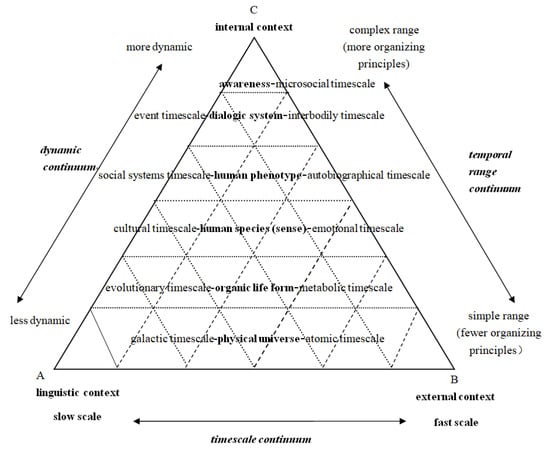 Each triangular interaction of the temporal ranges and timescales is governed by awareness, emotions, and more in the internal context. Awareness interacts dynamically with the other two types of related variables to form a communicative context. Simultaneously, although influenced by external variables, awareness has an active role, which is indicated by the inverted triangles in Figure 2. The triangle and its role, big or small, not only occur in the communicative context (main interactional processing), but also extend to auxiliary interaction, linguistic context, and external context (Figure 1 and Figure 2). Content/emotion schema comes from the complex awareness side of the internal context. The more cognition intervenes, the more internal contextual parameters are involved in the interaction or meaning-making. In the external context, collectively shared and socially distributed cognition stored in the brains of the human species can be transformed into extended cognition, i.e., external/physical environments viewed as part of cognition under the condition that the latter are processed in the brain []. The fundamental aim of cognition is to adapt to the environment [] that is structured in terms of cognitive activities. Similarly, as for linguistic context, cognition is language-based, forming a meaningful semiotic map [], which is essentially extended cognition, in that meaning derives more from the linguistic context, and a language with slow timescales evolves into different ‘forms’ and carries meanings of multidimensional simultaneity, both historical and sociocultural.