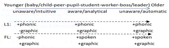 Socially, young learners map sound and meaning in immediate contexts in which simple utterances, physical objects, simple social roles, and more are aligned implicitly with one another via their socializing experiences. Thus, the older they are, the more sociolinguistically appropriate their language(s) will be. Given this, language teaching should take into consideration the three stages for the FLD route in which the order parameters change. Learners of different ages and cognitive levels are bound to have different roles and surroundings to align with at the three stages. On the one hand, FLD contexts are short of native speakers of the target language, especially their social roles in society. Thus, pseudo roles (‘Pseudo roles’ refer to the social roles that learners play in learning activities as they are not real or taking place in real social communications but role-played by the students in classroom settings. Such roles as boss or worker use language in different ways. One example will suffice: A boss may deploy the discourse marker ‘so’ or the high modality words, ‘must, should’, and the like, more frequently than a worker in their conversation.) and their speech extended cognitively in linguistic contexts are essential in the FLL context. On the other, social roles and role relations are enacted by the target language to which one is exposed. The roles one plays range from baby, child, peer, roommate, classmate to worker or boss and more, which demonstrates a bottom-up trajectory of development from the low strata of contexts (implicit awareness, low-level cognition and roles, phonic expression, and physical objects) to the upper ones (explicit awareness, high-level cognition and roles, graphic expression, and abstract concept or content), a continuum in fact. Such roles are closely realized by their corresponding language at the different stages. Furthermore, social roles embody their thoughts, emotions, values (cognitive schema), and responsibilities []. Thus, those who do not have correct role awareness or an understanding of their own and others’ roles or their thoughts, feelings, and values may have difficulties in social communications []. In this sense, context-language awareness can be better raised when role-playing and aligning with social roles and their speech, which is in line with the finding that implicit learning effects depend on role relationships in the FLL context []. Undoubtedly, explicit learning is necessary in some contexts [], in particular, when learners grow older with their analytical abilities developed, cf. [].