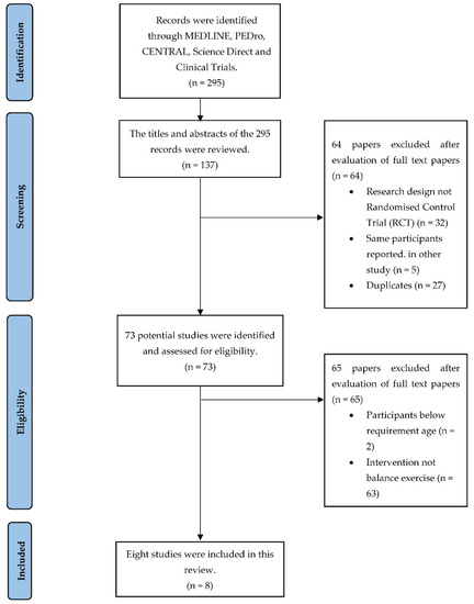 295 studies were identified from five database engines. The full-text articles of 73 studies were retrieved and assessed for eligibility. 65 studies were excluded as the average age of the sample population was less than 60 years (n = 2), and the intervention provided was not balance exercises (n = 63). A total of eight papers met our selection criteria and were chosen for this evaluation. The studies included in this review are as in the PRISMA flow diagram (Figure 1).