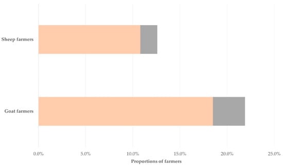 Sixty-seven farmers (15.1%; 95% confidence intervals (CI): 12.1–18.7%) reported that they had experienced a zoonotic problem (Table 1). Most of the farmers (n = 57; 85.1%, 95% CI: 74.7–91.7%, of those with a zoonotic problem—12.8%, 95% CI: 10.0–16.3%, of farmers interviewed) reported that the zoonotic problem had been brucellosis (Table 1); this was similar in sheep (n = 35) and goat (n = 22) farmers: 85.4% (95% CI: 71.6–93.1%) and 84.6% (95% CI: 66.5–93.9%) of all reports, respectively (p = 0.93) (Figure 2). Odds ratio for the occurrence of brucellosis in goat farmers was 1.879 (95% CI: 1.051–3.359) compared to the occurrence in sheep farmers (p = 0.033). Moreover, three farmers reported that they had been infested with fleas and one farmer that they had been infested with ticks.