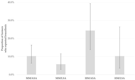 In contrast, brucellosis develops with acute and severe clinical signs and requires medical attention for management of the case []; hence, specific diagnosis was achieved and the affected farmers became aware of the problem. This contributed to its higher reporting than other zoonotic problems among this cohort of people. The infection is a well-established zoonotic disease, associated with professionals working with ruminants (e.g., farmers, milkers and veterinarians) [,].