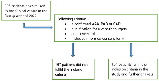 The data concerning the popularity of smoking were collected in the first quarter of 2022. In that period, there were 298 patients hospitalised in the clinical centre. The analysis included active smokers (n = 101, 33.9%)—Figure 1.