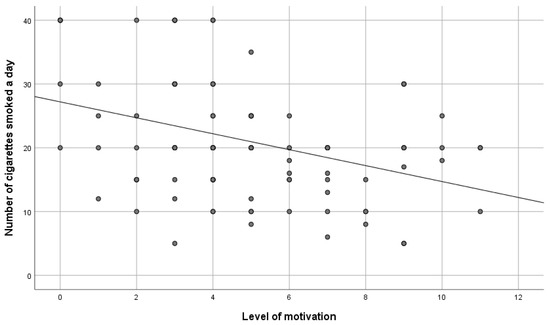 The survey did not confirm a statistically significant correlation between the number of years of smoking and the level of motivation for ceasing smoking (rHO = −0.11; p > 0.05 (Spearman correlation tests). In turn, a negative statistically significant correlation between the level of motivation and the number of cigarettes smoked a day was identified (rHO = −0.33; p = 0.001). It can be interpreted that the greater the number of cigarettes smoked a day, the lower the level of motivation for ceasing smoking among the respondents—Figure 2.