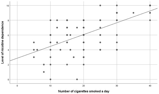 To verify the hypothesis, the Spearman correlation test was made. It confirmed a positive statistically significant and moderate correlation between the level of dependence and the number of cigarettes smoked a day (rHO = 0.58; p < 0.001). It can be interpreted that the greater the nicotine dependence, the greater the number of cigarettes smoked a day—Figure 3. In turn, the survey did not confirm a statistically significant correlation between the number of years of smoking and the degree of nicotine dependence (rHO = 0.16; p > 0.05).