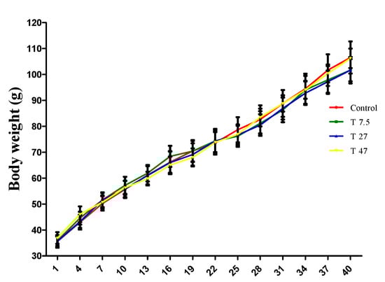 Effects of tartrazine on the bodyweight of immature female Wistar rats during 40 days of treatment. Control = animals receiving vehicle (distilled water, 10 mL/kg BW); T = rats treated with tartrazine at dose of 7.5; 27, and 47 mg/kg BW. Results are shown as a mean ± SEM, n = 5.