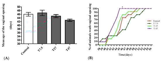 Effects of tartrazine on the mean age of the vaginal opening (A), the percentage (%) of rats with a vaginal opening (B) during 40 days of treatment. Control = animals receiving vehicle (distilled water, 10 mL/kg BW); T = rats treated with tartrazine at dose of 7.5; 27, and 47 mg/kg BW. Results are shown as a mean ± SEM, n = 5. *: p < 0.05 in reference to control.