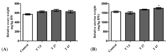 Effect of tartrazine on the relative weight of ovaries (A) and uterus (B) of immature female Wistar rats after 40 days of treatment. Control = animals receiving vehicle (distilled water, 10 mL/kg BW); T = rats treated with tartrazine at doses of 7.5; 27, and 47 mg/kg BW. Results are shown as a mean ± SEM, n = 5. *: p < 0.05 in reference to control.