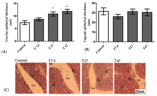 Effect of tartrazine on uterine (A) and vagina (B) epithelial height as well as microphotographs (25×) of hematoxylin/eosin-stained sections of uteri (C) of immature female Wistar rats after 40 days of treatment. Control = animals receiving vehicle (distilled water, 10 mL/kg BW); T = rats treated with tartrazine at doses of 7.5; 27, and 47 mg/kg BW. Results are presented as mean ± SEM; n = 5. *: p < 0.05; **: p < 0.01 compared to the control. Lu = Lumen; Ep = Epithelial cell thickness; St = Stroma.