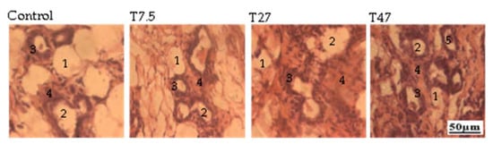 Microphotographs (25×) of hematoxylin/eosin-stained sections of mammary glands of immature female Wistar rats after 40 days of treatment. Control = animals receiving vehicle (distilled water, 10 mL/kg BW); T = rats treated with tartrazine at doses of 7.5; 27, and 47 mg/kg BW. 1 = Adipose tissue; 2 = Lumen of alveoli; 3 = Alveoli epithelium; 4 = Gland parenchyma; 5 = Eosinophilic secretion.