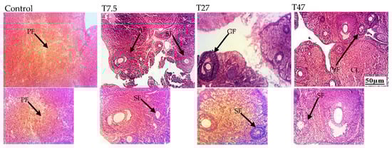Microphotographs (25× and 200×) of hematoxylin/eosin-stained sections of ovaries of immature female Wistar rats after 40 days of treatment. Control = animals receiving vehicle (distilled water, 10 mL/kg BW); T = rats treated with tartrazine at dose of 7.5; 27, and 47 mg/kg BW. Results are shown as a mean ± SEM, n = 5. PF = primordial follicle, PrF = primary follicle, SF = secondary follicle, AF = Antral follicle, GF = Graafian follicle, CL = corpora lutea.