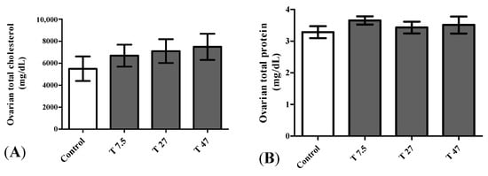 Effect of tartrazine on ovarian total cholesterol (A) and ovarian total protein (B) of immature female Wistar rats after 40 days of treatment. Control = animals receiving vehicle (distilled water, 10 mL/kg BW); T = rats treated with tartrazine at doses of 7.5; 27, and 47 mg/kg BW. Results are shown as a mean ± SEM; n = 5.