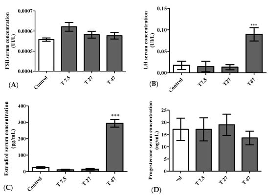 Serum concentration of Follicle Stimulating Hormone (FSH) (A), Luteinizing Hormone (LH) (B), Estradiol (C) and Progesterone (D) of immature female Wistar rats after 40 days of treatment. Control = animals receiving vehicle (distilled water, 10 mL/kg BW); T = rats treated with tartrazine at doses of 7.5; 27, and 47 mg/kg BW. Results are shown as a mean ± SEM; n = 5. ***: p < 0.001 in reference to control.